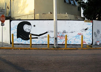 La verdad es que no estoy muy conectado con lo que pasa en cuanto a arte urbano en Monterrey, pero me doy cuenta que hay gente haciendo cosas interesantes en la ciudad.. se nota inmediatamente al recorrer las calles de la ciudad. Un arte urbano de muy buen gusto, muchas veces usando los mismos elementos que pueda tener la pared para usar como punto de partida. Los mismos Nrmales organizaron un tipo de happening donde diferentes artistas colaboraron para crear una pieza muy interesante una tarde en el Barrio Antiguo hace ya algunos años.