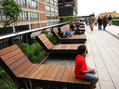 Hace dos años que estuve en NY durante el verano visite varias veces el Meat Packing District, y me llamo mucho la atención una enorme estructura de acero que cruzaba el barrio. En uno de esos trips subí a las oficinas de Smart Design y vi hacia abajo como esta estructura estaba abandonada, con un tipo de monte creciendo en ella, se veía muy bien, solo que estaba muy desaprovechada. Ahora es el centro de atención ya que la primera sección del tan anticipado “High Line” abrió hace poco con muchisimo éxito.