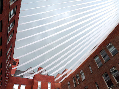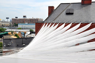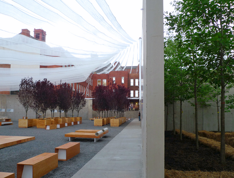 Probablemente lo más vistoso de la propuesta de Interboro Partners es el techo de tiras de tela que provee de sombra al patio del PS1. Utilizando los edificios alrededor y las paredes del museo, las tiras crean una modulación interesante que no necesita de columnas.
