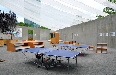Con el titulo “Holding Pattern” esta instalación creada por Interboro Partners incorpora elementos como mesas de ping-pong, bancas, macetas, entre otros objetos que serán posteriormente donados a organizaciones, grupos y casas alrededor del PS1. Cada una de las piezas de su diseño tiene una etiqueta con el nombre de la persona u organización a la cual “se le esta apartando”. Este interesante concepto no solo promueve el reciclaje y re-uso, también un sentimiento de comunidad alrededor de este museo que en ocasiones parece no encajar en su comunidad en Long Island City.