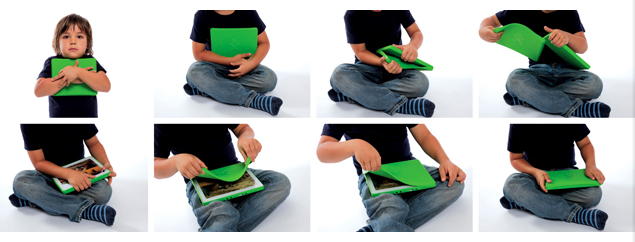 Pensado 100% en los niños que la utilizaran, la XO-3 tiene detalles como una funda de silicón que al ser desprendida de la pantalla se adhiere fácilmente al reverso de la tablet para proveer de un mayor grip al utilizarla. Esta misma cubierta tiene un panel solar