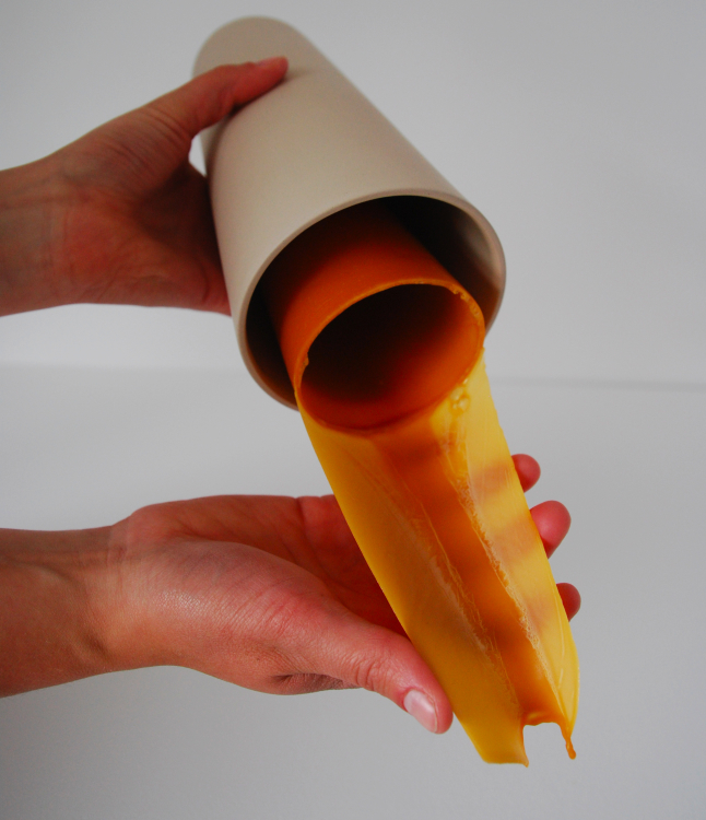 Un set de 3 piezas; una olla, una cuchara y una garrafa, sirven como moldes para crear una vajilla completa utilizando cera. La estudiante Maike Seeger del Design Academy de Eindhoven presentó su proyecto “Meltware” en el reciente show de graduados.